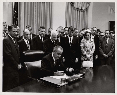In both images, Florence P. Dwyer, congresswoman of New Jersey, watches as Lyndon B. Johnson signs a document.